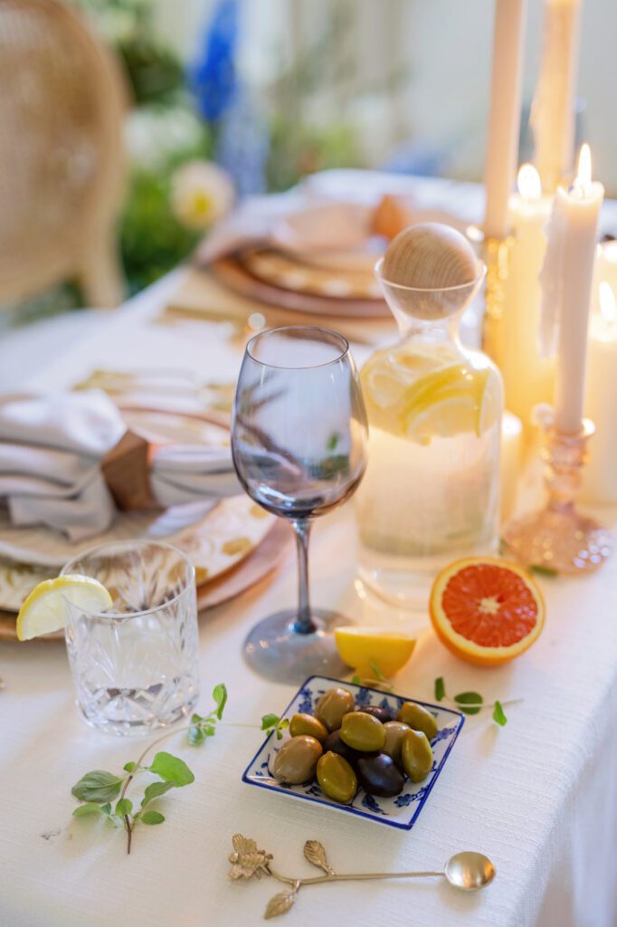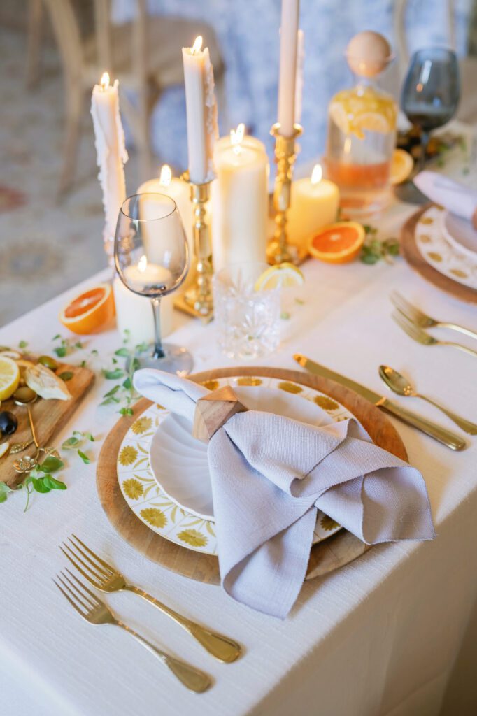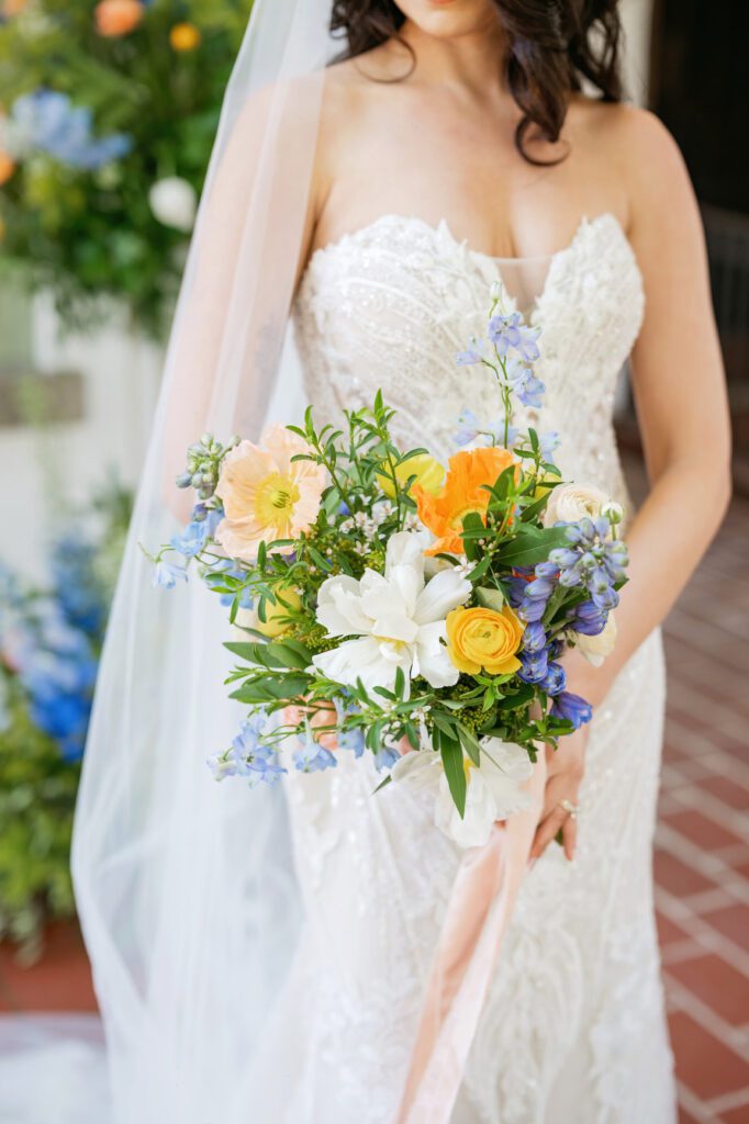 Steeped in history and European influence, the Hill House was the perfect backdrop to showcase Spring in North Carolina. With this in mind, we styled this shoot with all the elements of a garden soiree. The sun-drenched patio ceremony called for elements of fresh blooms local to North Carolina, and notes of blue and yellow as a nod to the Mediterranean Sea. Finally, peach tones tied into the color scheme to echo the terra cotta tile and stucco architecture.