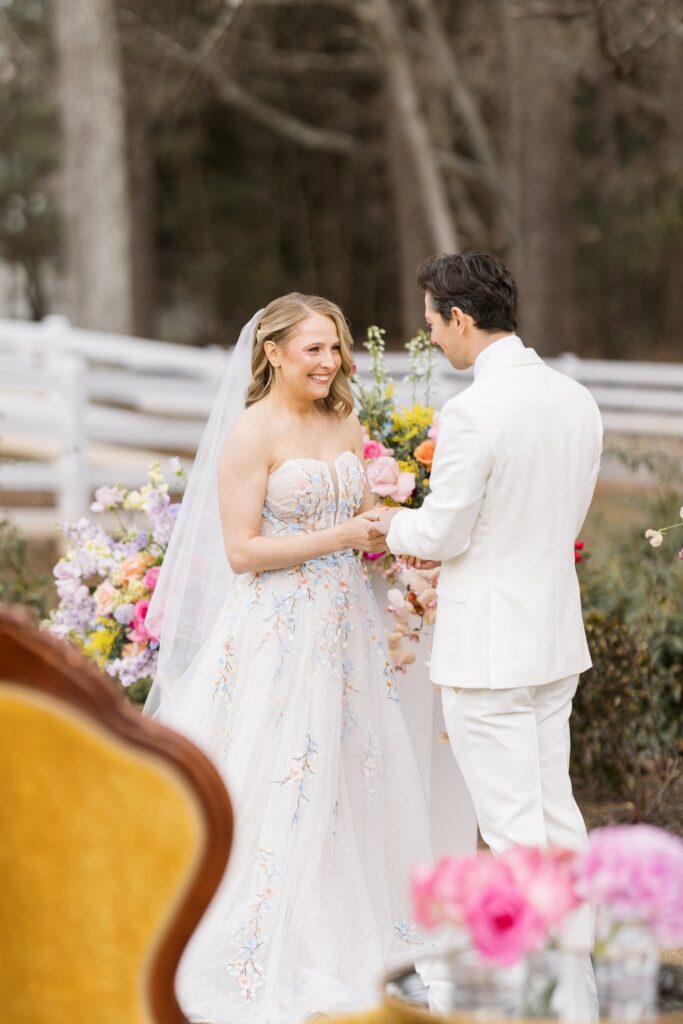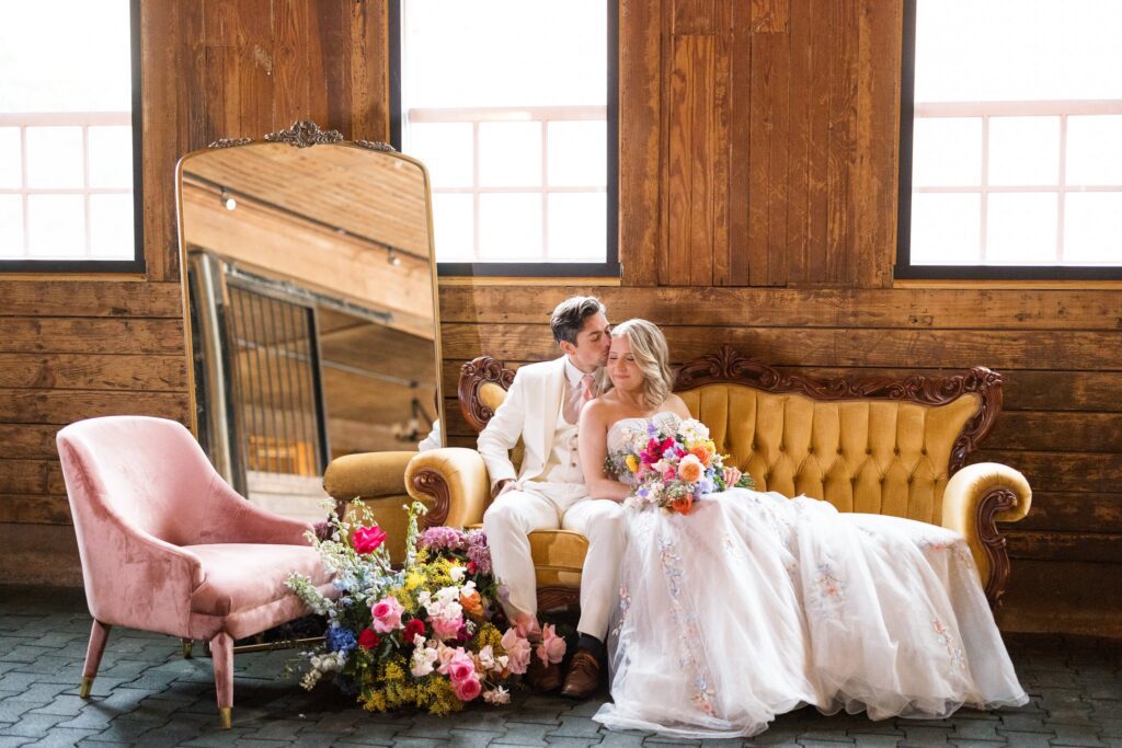 The courtyard ceremony at The Historic Wakefield Barn featured florals in loose, organic arrangements that mirrored the natural surroundings, while the barn’s rich wood tones and soaring ceilings provided a striking counterpoint to the soft, romantic design. Every detail was chosen with intention — from curated rentals and luxe linens to layered paper goods and painterly florals.