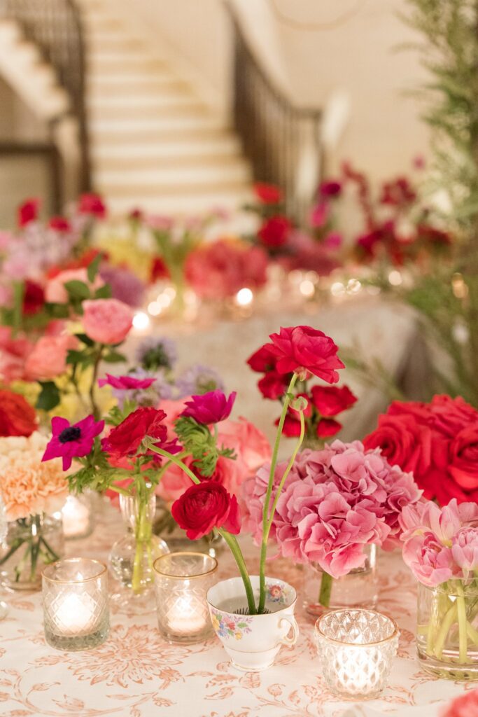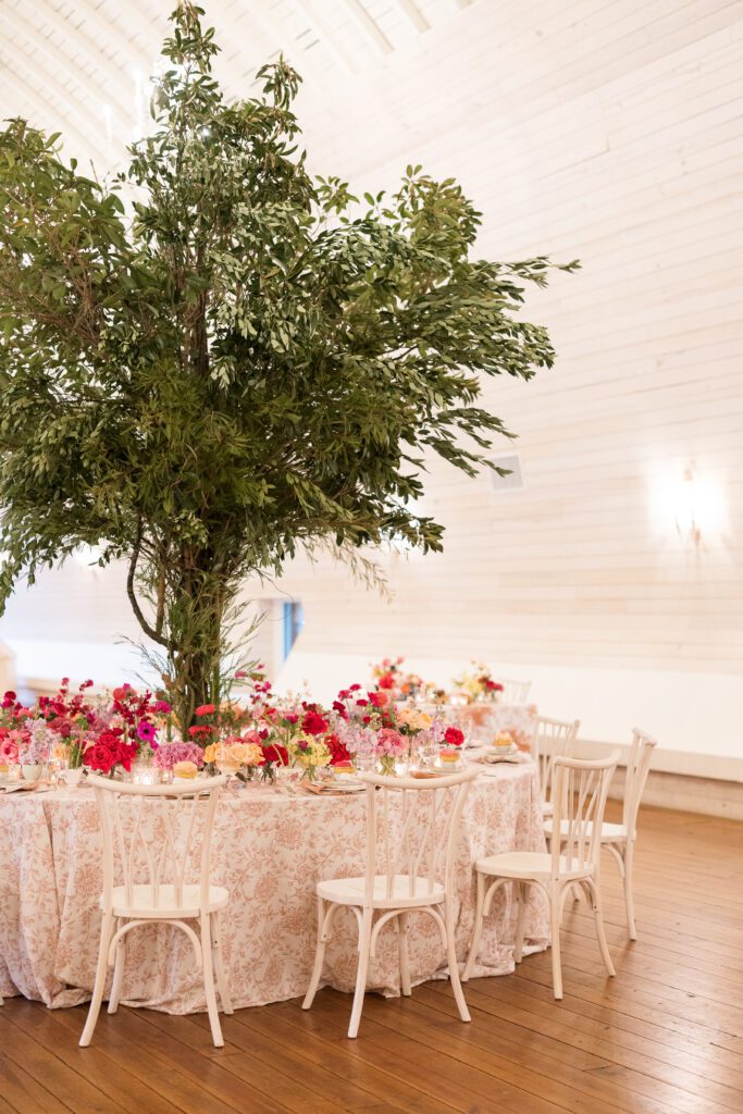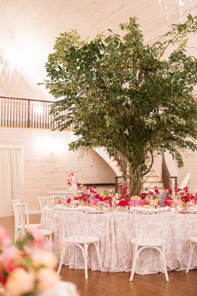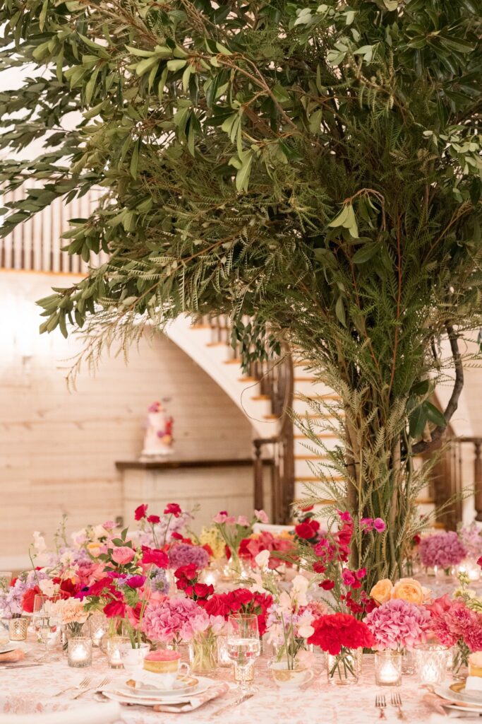 Soft hues of blush, lavender, dusty blue, and ivory created a delicate, romantic palette. Fine china, antique silver, and heirloom teacups added layers of texture and history. But the most captivating design moment came in the reception space, where a serpentine table with an open center embraced a full-scale tree at its core. The unexpected integration of nature within the tablescape invited guests to dine under a canopy of greenery, creating a visual experience that was both bold and graceful.