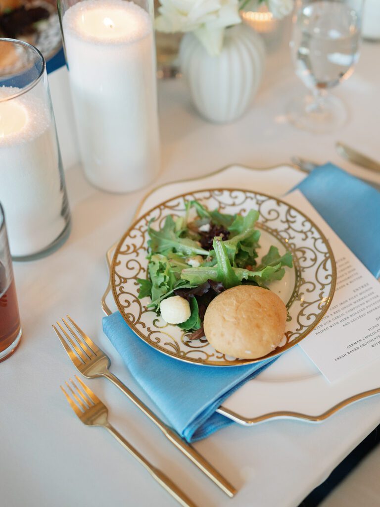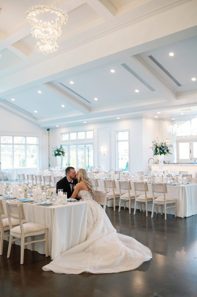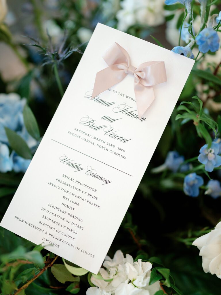 The reception design carried the palette indoors with a clean and cohesive look. Party Reflections provided soft blue linens, elegant tableware, and candlelight to create a warm and inviting space. The color palette was consistent in every detail, from the napkins to the custom signage. Alexis Scott Design tied everything together with modern stationery that reflected the couple’s vision perfectly.