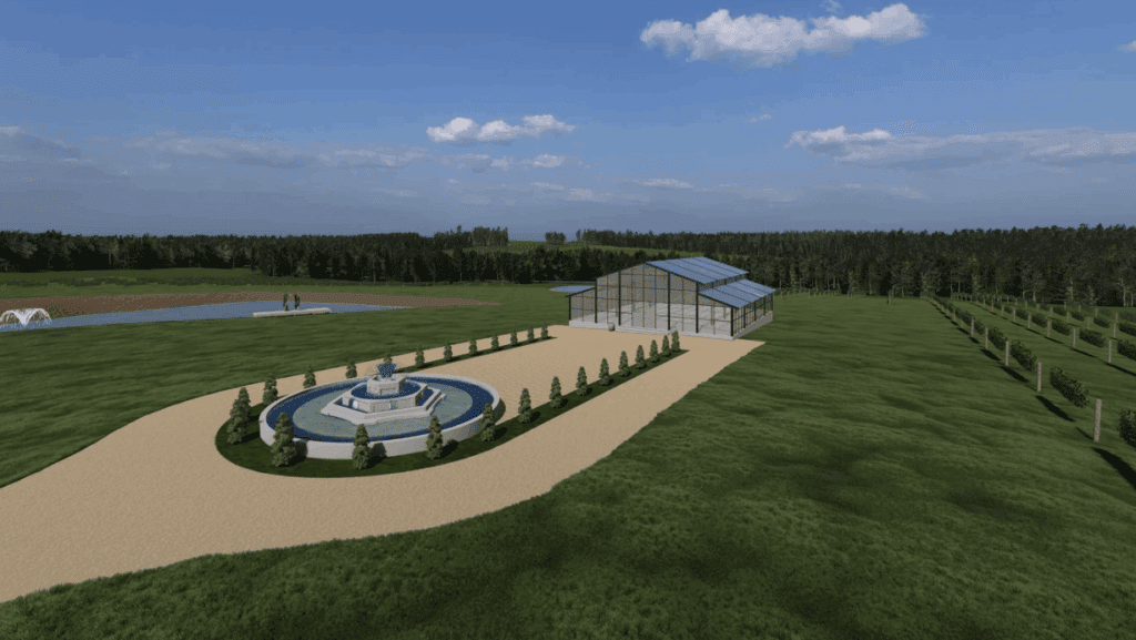 Hunt Family Vineyards features a contemporary glass atrium surrounded by vineyard rows and pond views. We love the opportunity to highlight the architecture with lighting and design elements that play off the transparent walls and natural scenery. The space feels modern and romantic, offering a beautiful backdrop for ceremonies, receptions, and full-service luxury design. The photo below is a rendering of the plans for their build, ready in March 2026. We are so excited to see this vision come to life!