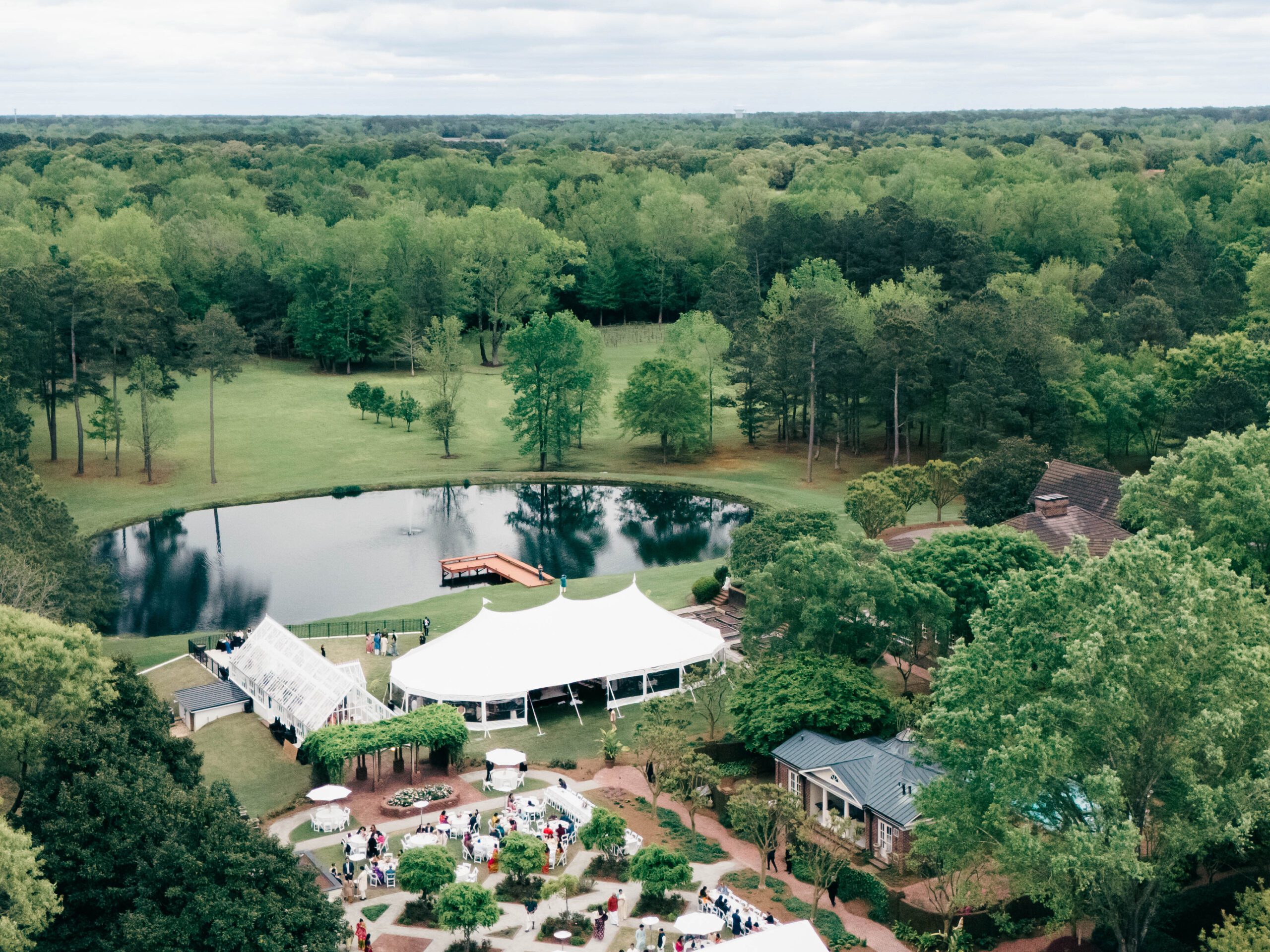 While sailcloth tents are beautiful, they can get warm in the summer as they filter light through, especially in North Carolina. Work with your wedding planner and tenting company to determine if sidewalls or other climate control options are needed. Additionally, make sure the ground properly drains. Even on a sunny wedding day, muddy grounds from prior rain can be a problem. If your space has drainage issues, consider adding flooring.