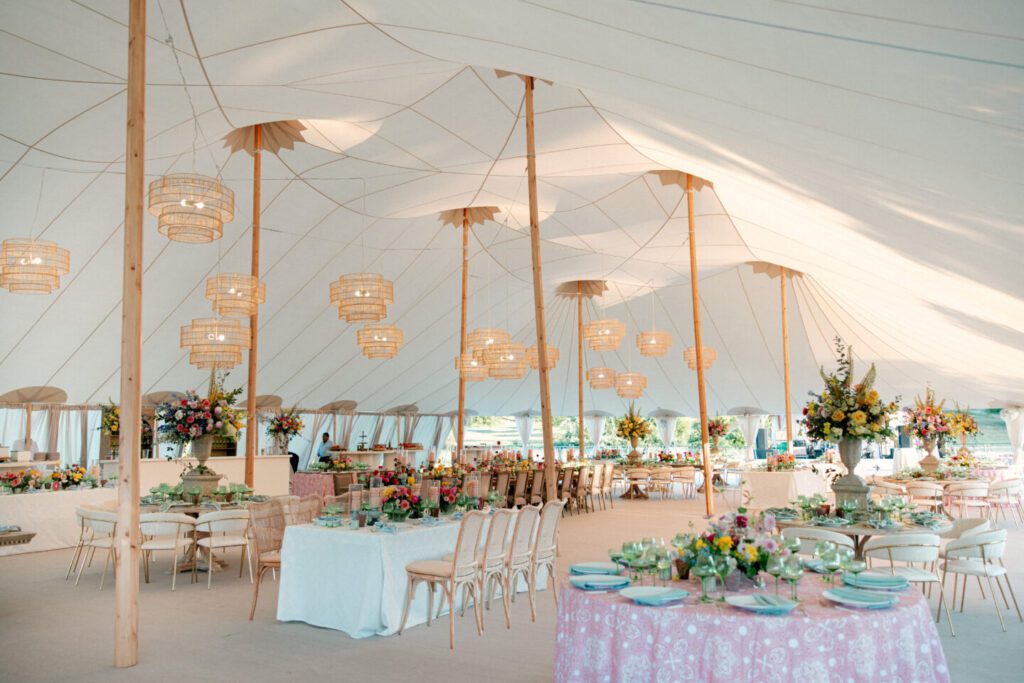 When designing a sailcloth tent wedding, remember that you are not working in a traditional venue. Lighting is essential. You’ll need ambient lighting as well as design “pops” to highlight your décor. Keep in mind that weight is a concern. Light fixtures, chandeliers, and floral installations must not compromise the tension-based structure of the tent. Your wedding planner will coordinate with the tenting company to ensure all installations are properly supported.
